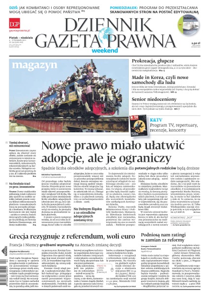 Made in Korea, czyli nowe samochody dla ludu; choć liczba mieszkańców Ziemi przekroczyła siedem miliardów, wielu krajom rozwiniętym grozi zapaść demograficzna; spadnie liczba ośrodków adopcyjnych, a szkolenia dla potencjalnych rodziców będą droższe; Francja i Niemcy groźbami wymusiły na Atenach zmianę decyzji o referendum; jak Polska może zyskać na niepokojach w strefie euro; Netia ma problem, bo jego główne koło napędowe – rynek stacjonarnego internetu – wyraźnie hamuje; właściciele firm płacący niski ZUS powinni móc dobrowolnie opłacać składki na Fundusz Pracy.