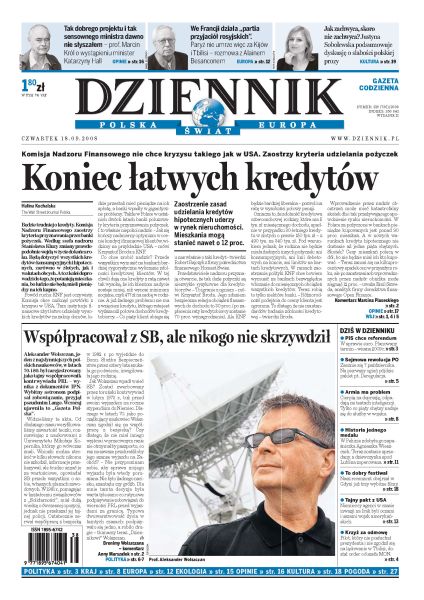 Komisja Nadzoru Finansowego zaostrzy kryteria udzielania pożyczek; PiS chce, by Polacy zdecydowali w referendum, kiedy euro ma zastąpić złotówkę; słynny polski astronom Aleksander Wolszczan był agentem bezpieki; 80 procent kandydatów na żołnierzy nie spełnia wymogów służby w zawodowej armii; w Polsce brakuje spójnego systemu opieki nad dzieckiem i rodziną; Francja zamierza doprowadzić do zablokowania starań Gruzji i Ukrainy o przystąpienie do NATO; USA próbują załagodzić konflikt z Pakistanem; rozpoczyna się wyścig o złoża ropy i gazu Arktyki.