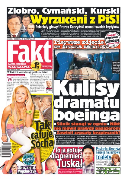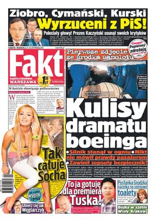 Przed lądowaniem boeinga 767 nikt nie mówił pasażerom prawdy, tymczasem przyczyną awarii mógł być przepalony bezpiecznik; kapitan Tadeusz Wrona i drugi pilot Jerzy Szwarc: latanie to ich pasja od dziecka; Zbigniew Ziobro, Jacek Kurski i Tadeusz Cymański zostali wyrzuceni z PiS-u; od 1 stycznia wzrasta akcyza na wyroby tytoniowe – paczka papierosów może być droższa nawet o niemal złotówkę; kulisy poufnej narady u Donalda Tuska: jedzenie od „chińczyka” po 11 zł za porcję; 22 osoby ranne w wypadku tramwajowym we Wrocławiu; cała prawda o Bilguunie Ariunbataarze z „Szymon Majewski Show”; ubierz się jak Bartosz Węglarczyk; bójka w szatni Wisły Kraków; w Tarnowie powstanie żużlowa drużyna marzeń.