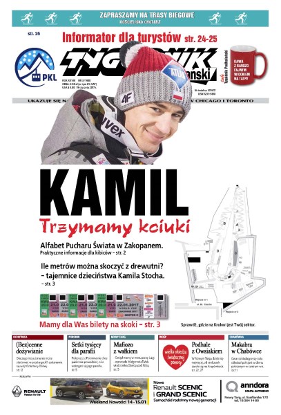 Alfabet Pucharu Świata w Zakopanem – praktyczne informacje dla kibiców; ile metrów można skoczyć z drewutni - tajemnice dzieciństwa Kamila Stocha; dwa rozkładające się ciała odnalazł policjant w domu położonym w centrum wsi; dlaczego moja żona nie może startować w przetargach – zastanawia się wójt Ochotnicy Dolnej; proboszcz z Poronina nie chce publicznie powiedzieć, o ile wzbogaci się jego parafia; Podhale z Owsiakiem – w Nowym Targu działo się najwięcej, od serduszek zaroiło się na Krupówkach; informator dla turystów.