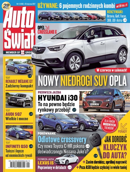 Opel Crossland X – nowy crossover i inne planowane premiery Opla; Hyundai i30 – pierwsza jazda kompaktem trzeciej generacji; Lexus IS – jeździliśmy sedanem premium po face liftingu; Porsche 911 GTS – jeszcze jedna wersja rasowego sportowca; sprzedaż nowych aut – rynkowe podsumowanie roku 2016; Toyota C-HR kontra Nissan Juke – porównanie crossoverów z silnikami 1.2 turbo; Audi SQ7 – duży SUV z 4-litrowym dieslem V8; Seat Alhambra – van z napędem 4x4; kluczyk samochodowy – gdzie dorobić kluczyk i immobiliser.
