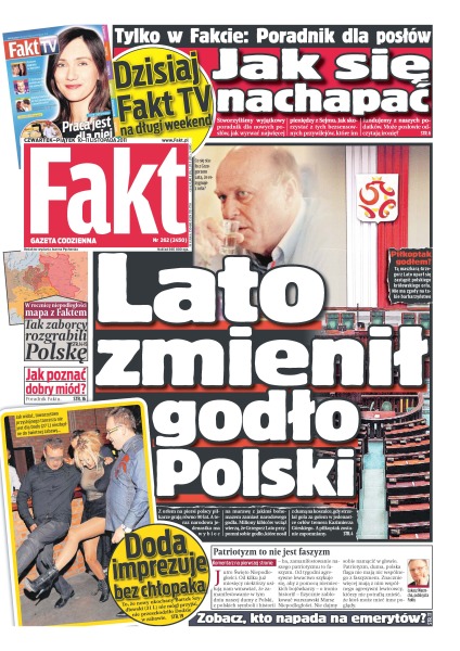 Grzegorz Lato zmienił godło Polski; Doda imprezuje bez swojego chłopaka; jak poznać dobry miód; o ochronę Ewy Kopacz dba funkcjonariuszka Biura Ochrony Rządu; młodzi bandyci z Łodzi napadali na emerytów; Małgorzata Kożuchowska wypiła szampana za śmierć Hanki Mostowiak.