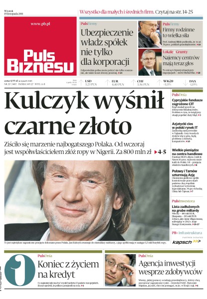 Jan Kulczyk wyśnił czarne złoto – od wczoraj jest współwłaścicielem złóż ropy w Nigerii; ubezpieczenie władz spółek nie tylko dla korporacji – odpowiednia polisa może pokryć nie tylko roszczenie, ale także koszt obrony prawnej; firmy rodzinne to wielka siła – wg profesora Andrzeja Blikle to aż 78 procent polskich przedsiębiorstw; azjatycki cios w polski rynek IT – przez powodzie w Tajlandii ceny twardych dysków idą w górę – będą problemy z dostawą komputerów; fundusz MGPA zbiera dwa miliardy złotych na przejęcia obiektów handlowych; lista zadłużonych na grube miliardy; koniec z życiem na kredyt – politycy przejrzeli na oczy.