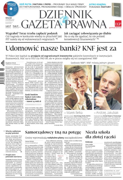 KNF jest za udomowieniem naszych banków; czy nagroda w konkursie wiedzy to przychód – jaki PIT należy się od wylosowanych wygranych; jak zaciągać zobowiązania po ślubie – na co się nie zgadzać, by nie ponieść konsekwencji finansowych; Włochy są zadłużone na pięć pokoleń; drogie euro pokonało narciarzy; samorządowcy tną na potęgę – gminy wprowadzają radykalne plany oszczędnościowe; niezła szkoła dla złotej rączki.