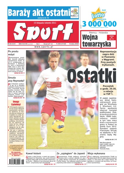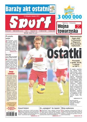 Reprezentacja zagra dziś w Poznaniu z Węgrami przy pustych trybunach; ostatni akt baraży; reprezentacja Polski do lat 21 doznała zawstydzającej porażki z Mołdawią – przegrali mecz we Wronkach 0-1; Franciszek Smuda w razie rozstania z kadrą po Euro 2012 mógłby zostać trenerem Wisły Kraków; reprezentacja Polski siatkarzy wyleciała wczoraj rano w pełnym składzie do Japonii, gdzie wkrótce rozpocznie się prestiżowy Puchar Świata; na igrzyska w Londynie uda się 9-osobowa reprezentacja.