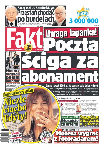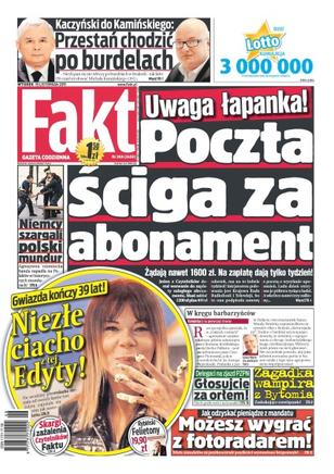 Uwaga łapanka – poczta ściga za abonament; Niemcy szargali polski mundur; „Przestań chodzić po burdelach” – Jarosław Kaczyński do Mariusza Kamińskiego; niezłe z niej ciacho – Edyta Górniak kończy 39 lat; „Głosujcie za orłem” – delegaci na zjazd PZPN; zagadka wampira z Bytomia; możesz wygrać z fotoradarem – jak odzyskać pieniądze z mandatu; skargi i zażalenia czytelników Faktu.