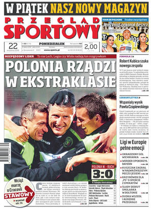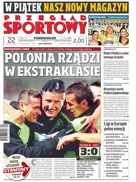 Po wygranej 3:0 nad Ruchem Polonia Warszawa umacnia się na pozycji lidera Ekstraklasy; wywiad z Wojciechem Stawowym, bezrobotnym trenerem; Chelsea zremisowała 1:1 z MU, Tomasz Kuszczak stanął w bramce Czerwonych Diabłów; Artur Wichniarek zdobył bramkę, która wywołała sporo kontrowersji; Robert Kubica wciąż nie wie, barwy jakiego teamu będzie reprezentował w 2009 roku; rozmowa z Jensem Voigtem, zwycięzcą Tour De Pologne; fantastyczny wynik Pawła Czapiewskiego podczas mityngu lekkoatletycznego w Szanghaju.