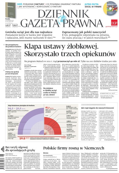 Klapa ustawy żłobkowej – skorzystało trzech opiekunów, a rząd przeznaczył na program „Maluch” 40 milionów złotych; gotówka wciąż jest dla nas najtańsza – posiadanie konta w banku jest wygodne i opłacalne, jeśli mamy rachunek w sieci; zapracowany jak polski nauczyciel – osiem tysięcy pedagogów odpowiada na pytania, ile czasu pracują i w jakich warunkach; złe perspektywy dla polskich banków – agencja Moody's obniżyła perspektywę ratingów dla całego sektora; fiskus da spokój przed świętami; jak rząd sięgnie do naszych kieszeni; polskie firmy rosną w Niemczech.
