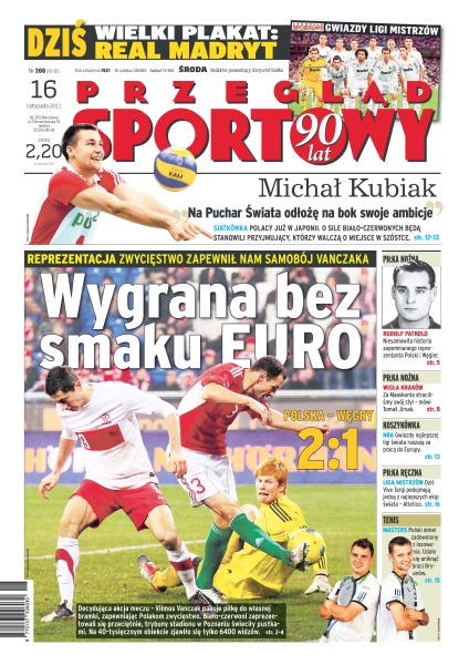Wygrana bez smaku EURO – zwycięstwo reprezentacji zapewnił nam samobój Vilmosa Vanczaka; „Na Puchar Świata odłożę na bok swoje ambicje” – Michał Kubiak; Rudolf Patkolo – niesamowita historia zapomnianego reprezentanta Polski i Węgier; Tomas Jirsak twierdzi, że Wisła Kraków za panowania Maaskanta straciła swój styl; gwiazdy NBA ruszają za pracą do Europy; Liga Mistrzów w piłce ręcznej – Vive Targi zawalczą dziś z Atletico – jedną z najlepszych ekip świata; polski debel zadowolony z losowania na turnieju Masters – udało się odsunąć braci Bryanów.
