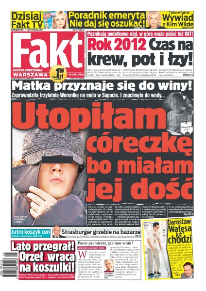 „Utopiłam córeczkę bo miałam jej dość” – matka przyznaje się do winy: zaprowadziła trzyletnią Weronikę na molo w Sopocie i zepchnęła do wody; Jarosław Wałęsa już chodzi; Strasburger grzebie na bazarze; Lato przegrał – orzełek wraca na koszulki; rok 2012 – czas na krew, pot i łzy – poznikają podatkowe ulgi, w górę może pójść też VAT; poradnik emeryta – nie daj się oszukać.