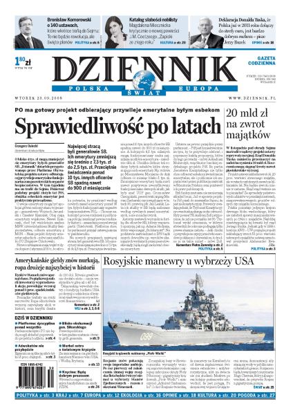 PO ma gotowy projekt odbierający przywileje emerytalne byłym esbekom; manewry rosyjskiej marynarki wojennej u wybrzeży USA; nadawcy komercyjni będą mogli starać się o pieniądze na programy misyjne na równi z TVP i Polskim Radiem; 34 procent Polaków opowiada się za otwarciem granic dla wszystkich imigrantów; przychodnie prowadzące bezpłatne szczepienia przeciw wirusowi HPV pełne są nastolatek; po burzliwej debacie francuski rząd zgodził się na dalszy udział w operacji NATO pod Hindukuszem; w Kolonii rozpoczęły się międzynarodowe targi fotograficzne Photokina 2008.