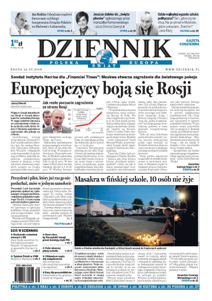 Wojna w Gruzji zmieniła obraz Rosji w oczach mieszkańców zachodniej Europy; Ludwik Dorn chce, by prezes Jarosław Kaczyński stanął przed komisją etyki własnej partii; Polacy najwcześniej w Unii Europejskiej zostają emerytami; byli funkcjonariusze bezpieki tworzą nieformalną grupę towarzysko-biznesową; rząd przygotował ustawę, która ma zapobiec burdom na stadionach; MEN chce wprowadzić dodatkowe zajęcia wyrównawcze dla uczniów szkół podstawowych; 22-letni psychopata zastrzelił 10 uczniów szkoły w Kauhajoki.