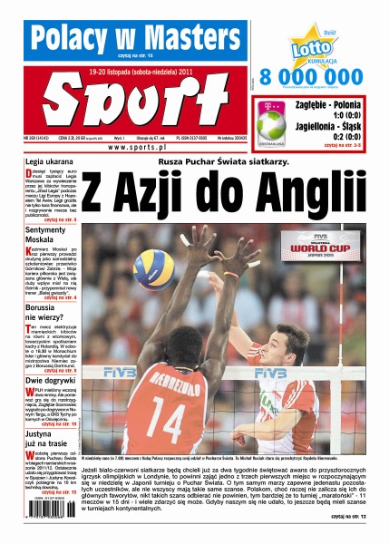 Rusza Puchar Świata siatkarzy – Polacy marzą o zdobyciu przepustki na igrzyska olimpijskie w Londynie; Jagiellonia po raz pierwszy w tym sezonie przegrała na własnym stadionie; rezerwowi zawodnicy zapewnili zwycięstwo Zagłębiu Lubin w meczu z Polonią Warszawa; analiza przed kolejnymi spotkaniami piłkarskiej ekstraklasy; w niedzielę w Londynie rozpoczyna się turniej Masters z udziałem polskiego debla Fyrstenberg-Matkowski; Justyna Kowalczyk rozpoczyna zawody Pucharu Świata biegiem na 10 km techniką dowolną.