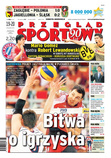 Śląsk Wrocław wygrał z Jagiellonią i jest liderem pełną gębą; Mouhamadou Traore zapewnił zwycięstwo Zagłębiu Lubin w meczu z Polonią Warszawa; rozmowa z trenerem warszawskiej Legii Maciejem Skorżą; analiza przed kolejnymi meczami ekstraklasy; występ Artjoma Rudniewa nadal pod znakiem zapytania; hity zagraniczne – Chelsea zagra z Liverpoolem, a Bayern Monachium z Borussią Dortmund; w Japonii rusza siatkarski Puchar Świata – Polacy zagrają przeciw Kubie; Fyrstenberg i Matkowski rozpoczynają World Tour Finals; Justyna Kowalczyk pobiegnie na 10 km stylem dowolnym w pierwszych zawodach Pucharu Świata.