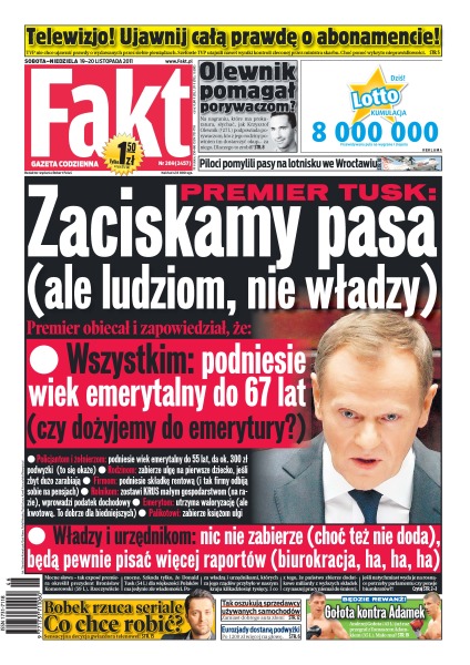 Premier Donald Tusk wygłosił expose i zapowiedział zaciskanie pasa – wszystkim oprócz władzy; nowy minister zdrowia jest palaczem; „Fakt” domaga się od Telewizji Polskiej ujawnienia całej prawdy o wydatkach z naszych abonamentów; eurozjady od nowego roku dostaną po 1,2 tys. zł podwyżki; czy Krzysztof Olewnik pomagał swoim porywaczom; o krok od tragedii – piloci pomylili pasy na lotnisku we Wrocławiu; Janusz Józefowicz zdradza, że chciał odejść z „Tańca z gwiazdami”; Andrzej Gołota i Tomasz Adamek rozmawiają o walce, której zwycięzca zgarnie milion dolarów; Adolf Hitler okradał własne państwo i od 1934 roku nie płacił podatków.