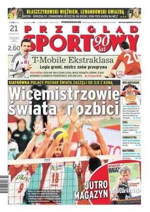 Wicemistrzowie świata rozbici – polscy siatkarze rozpoczęli Puchar Świata od pokonania Kuby 3-0; Błaszczykowski więźniem, Lewandowski gwiazdą – Borussia Dortmund pokonała Bayern 1-0; T-Mobile – Legia nie dała szans Lechii, Wisłę pogrążył Górnik, Śląsk rozmawia o zimowych transferach; Justyna Kowalczyk sezon zaczęła od 10. lokaty; transfery w żużlu – Pedersen w Lotosie, Marma chce Łagutę, a Falubaz Walaska; Piotr Małachowski tłumaczy, dlaczego spokorniał; niespodziewana porażka PGE Turów w Tauron Basket Lidze.