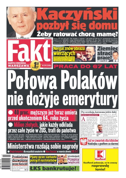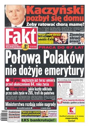 Połowa Polaków nie dożyje emerytury – 40 procent mężczyzn już teraz umiera przed ukończeniem 64 roku życia; ministerstwa rozdają sobie nagrody – drogie komputery dla wszystkich senatorów i nowe limuzyny w resorcie zdrowia; pijany ojciec siatkarki potrącił nastolatków; przekleństwa dozwolone przez Kościół; ŁKS bankrutuje; Nergal znów obraża wierzących; Ziemiec straci pracę; Jarosław Kaczyński pozbył się domu, żeby ratować chorą mamę.