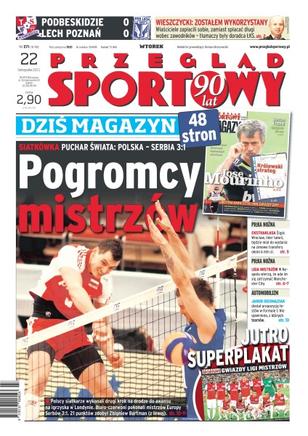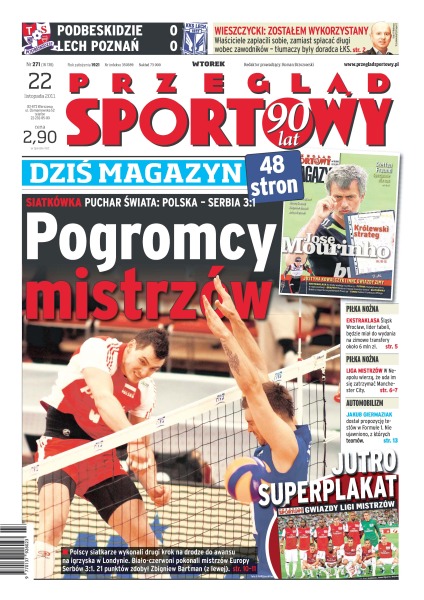 Pogromcy mistrzów – Polska pokonała Serbię 3-1 w Pucharze Świata; Podbeskidzie zremisowało z Lechem Poznań 0-0; „zostałem wykorzystany” – Wieszczycki, były doradca ŁKS – właściciele zapłacili sobie, zamiast spłacać długi wobec zawodników; Śląsk Wrocław, lider tabeli, będzie miał do wydania na zimowe transfery około sześciu milionów złotych; w Neapolu wierzą, że uda im się zatrzymać Manchester City; Jakub Giermaziak dostał propozycję testów w Formule 1 – nie ujawniono, z których teamów.