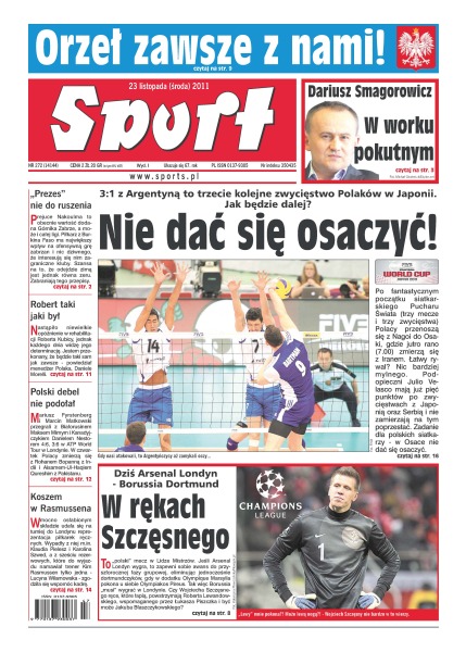 Polska reprezentacja siatkarzy odniosła kolejne zwycięstwo w Japonii – tym razem pokonała Argentynę 3-1; dziś mecz Arsenal Londyn - Borussia Dortmund – wszystko w rękach Szczęsnego; Dariusz Smagorowicz w worku pokutnym; Orzeł zawsze z nami – powraca na reprezentacyjne koszulki; Prejuce Nakoulma ma największy wpływ na ofensywną grę Górnika Zabrze – interesują się nim zagraniczne kluby jednak nie odejdzie zimą z klubu – zabraniają mu tego przepisy; wg menedżera Robert Kubica już niedługo będzie taki sam jak zawsze; reprezentacja piłkarek ręcznych udała się do Londynu w mocno osłabionym składzie.