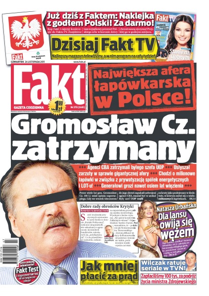 Największa afera łapówkarska w Polsce – Gromosław Cz. zatrzymany – chodzi o milionowe łapówki, generałowi grozi nawet osiem lat więzienia; Natasza Urbańska dla lansu owija się wężem; jak mniej płacić za prąd; Wilczak ratuje seriale w TVN; zapłaciliśmy 100 tysięcy za podróż życia ministra Zdrojewskiego.