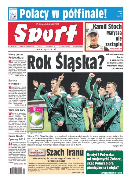 Czy to rok Śląska – wicemistrzowie Polski z Wrocławia podejmują dziś mistrzów kraju z Krakowa; Polacy w półfinale – Mariusz Fyrstenberg i Marcin Matkowski odnieśli dwa zwycięstwa i awansowali do półfinału turnieju Masters; „Małysza nie zastąpię” – Kamil Stoch; nowy prezes Podbeskidzia; polscy siatkarze przegrali z Iranem 2-3; rusza Nordic Opening 2011; spekuluje się, że były prezes Polonii Bytom - Damian Bartyla - stanie na początku przyszłego roku na czele zarządu Piasta Gliwice.