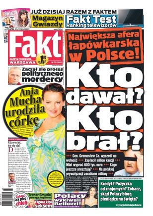 Największa afera łapówkarska w Polsce – kto dawał, a kto brał; Ania Mucha urodziła córkę; Polacy wykiwali Monikę Bellucci – międzynarodowy skandal; trener Smuda pomaga Anglikom; Kasia Figura kipi seksem; zobacz jak piec chleb; zaczął się proces politycznego mordercy – zabójcy pracownika biura PiS.