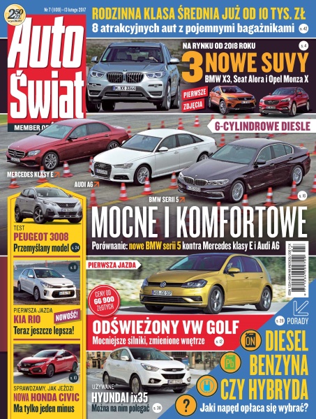 BMW X3, Seat Alora i Opel Monza X – małe SUV-y, które wkrótce trafią na rynek; Opel Insignia Sports Tourer – prezentacja drugiej generacji flagowego kombi; Kia Rio – pierwsze jazdy Rio w nowym wydaniu; VW Golf – jazdy hatchbackiem po face liftingu; BMW serii 5 kontra Audi A6 i Mercedes klasy E – porównanie niemieckich limuzyn klasy wyższej z 6-cylindrowymi dieslami 3.0; Peugeot 3008 – SUV z napędem na przednią oś i silnikiem 1.2 turbo; Skoda Superb – limuzyna w 150-konnej wersji 1.4 TSI; diesel, benzyna czy hybryda – radzimy, jaki rodzaj napędu wybrać.