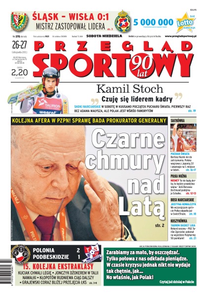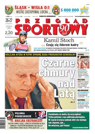 Czarne chmury nad Grzegorzem Latą i Zdzisławem Kręciną, kolejna afera w PZPN już pod lupą prokuratora generalnego; Wisła Kraków pokonała na wyjeździe Śląsk Wrocław i wraca do gry o obronę tytułu mistrza Polski; Edgar Kani odwrócił losy spotkania i zapewnił warszawskiej Polonii zwycięstwo nad Podbeskidziem Bielsko-Biała; Dusan Kuciak opowiada o swoich zadaniach w bramce Legii Warszawa; na czym polegają problemy zdrowotne Artjoma Rudniewa; w niedzielę mecz Liverpoolu z Manchesterem City; hit Bundesligi: Borussia Dortmund v. Schalke 04 Gelsenkirchen; polscy siatkarze jak na rollercoasterze: po przegranej z Iranem zwycięstwo nad Japonią; Justyna Kowalczyk odpadła w ćwierćfinale sprintu, zwyciężyła oczywiście Marit Bjoergen; sensacje w tenisowym turnieju Masters.