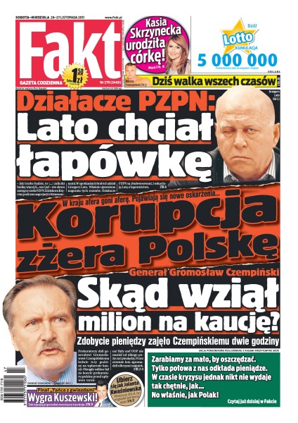 Generał Gromosław Czempiński w ciągu dwóch godzin znalazł milion złotych i zapłacił kaucję, aby uniknąć aresztu; życie i bogata kariera Czempińskiego; działacze PZPN oskarżają Grzegorza Latę i Zdzisława Kręcinę o udział w procederach korupcyjnych; posłanka Anna Grodzka ubiera się w sklepach dla puszystych; co Polacy wiedzą o oszczędzaniu; poprzedni triumfatorzy „Tańca z gwiazdami” typują dzisiejszego zwycięzcę; dziś rewanżowa walka Mariusza Pudzianowskiego z Jamesem Thompsonem; Kamil Stoch mówi, że jest dobrze przygotowany do sezonu zimowego; polscy siatkarze wygrali z Japonią; George Michael może być chory na AIDS.