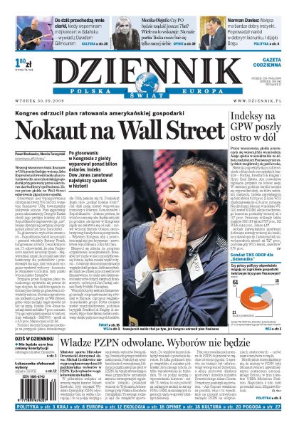 Kongres odrzucił plan ratowania amerykańskiej gospodarki; przez warszawska giełdę przetoczyła się wczoraj fala wyprzedaży; nie będzie euro bez zmian w konstytucji; profesor Norman Davies o Lechu Wałęsie; kurator kontroluje PZPN, Listkiewicz odsunięty; w sejmie awantura o sześciolatki; Trybunał Konstytucyjny orzekł, że kary za brak autoryzacji wypowiedzi cytowanej są zgodne z prawem; polski inżynier porwany w Pakistanie był obserwowany od dłuższego czasu, ślady prowadzą do Talibów. Dodatki: The Wall Street Journal, Warszawa, Nieruchomości, Targi 2009.