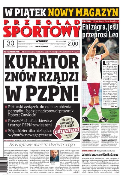 Kurator w PZPN, Michał Listkiewicz odsunięty od władzy; zarząd działał nielegalnie- wywiad z Mirosławem Drzewieckim; Leo nie potrafi porozumieć się ze Smolarkiem; rozmowa z Marcinem Lewandowskim; w Widzewie nie ma kryzysu- twierdzi Waldemar Fornalik; Lubański prezesem Górnika Zabrze; Grand Prix Singapuru to był najbardziej wyczerpujący wyścig sezonu; według Golloba komuś zależy na jego porażce; odwiedziny u Tomasza Adamka.