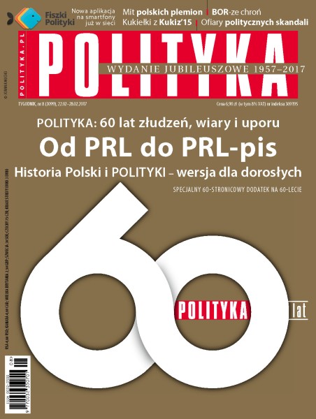 Jubileusz POLITYKI – specjalny dodatek – 60 stron na 60-lecie; bajka o dwóch polskich plemionach; BOR-ze chroń; Paweł Kukiz – radykalnie niestabilny; kobiety fatalne polityki; bomba Trumpa; Eike Batista – od milionera do zera; czy wieczna młodość jest możliwa; uderzyć w smog od dołu; oscarowe typy; rozmowa z Wacławem Zimplem, klarnecistą i kompozytorem, laureatem Paszportu POLITYKI w kategorii Muzyka popularna; Dale Carnegie i jego kultowy poradnik; Berlin – górą Holland i Poland; rozmowa z prof. Andrzejem Friszke o PRL i jej recydywie; rozmowa z prof. Antonim Dudkiem o blaskach i cieniach III RP; rozmowa z prof. Jackiem Raciborskim o polskim społeczeństwie ostatnich 60 lat, rewolucjach i ewolucjach, jakie wspólnie przeszliśmy; rozmowa z prof. Tadeuszem Kowalskim o najnowszej historii, stanie i perspektywach rynku mediów w Polsce; rozmowa z dr. hab. Mirosławem Filiciakiem o przyszłości informacji i dziennikarstwa.