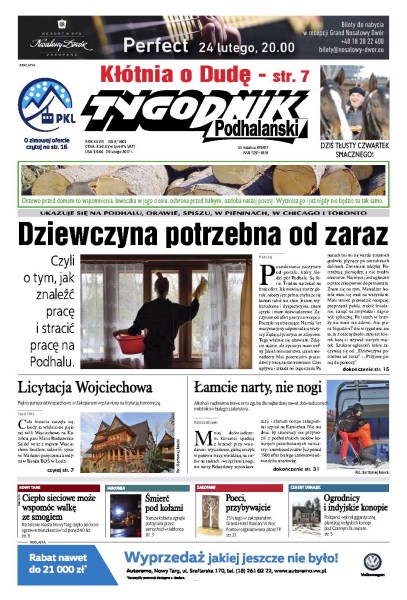 Jak znaleźć pracę i stracić pracę na Podhalu; licytacja Wojciechowa – piękny pensjonat Wojciechowo w Zakopanem wystawiony na licytację komorniczą; alkohol i nadmierna brawura to zguba dla najbardziej nawet doświadczonych miłośników białego szaleństwa; ciepło sieciowe może wspomóc walkę ze smogiem; 25 lutego w zakopiańskim Grand Hotel Stamary VI Noc Poetów organizowana przez TP; policjanci wykryli gigantyczną plantację indyjskich konopi pod Czarnym Dunajcem.