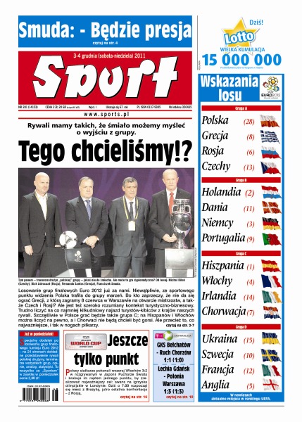 Odbyło się losowanie grup finałowych Euro 2012 – Polska trafiła do grupy marzeń z Grecją, Czechami i Rosją; opinie po losowaniu; analiza grupowych rywali Polaków; GKS Bełchatów zremisował z Ruchem Chorzów, a Polonia Warszawa pokonała w Gdańsku Lechię; co może się wydarzyć w dzisiejszych meczach Ekstraklasy; mistrz Krzysztof Włodarczyk wziął udział w ceremonii ważenia przed walką Dawida Kosteckiego z Byronem Mitchellem, trener Asseco Tomas Pacesas tłumaczy się z kompromitacji z Barceloną; siedmiu Polaków wystąpi w konkursie skoków narciarskich w Lillehammer; naszym siatkarzom brakuje tylko jednego punktu do szczęścia.