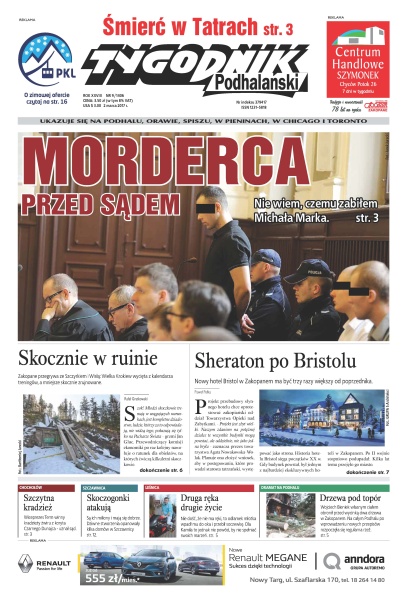 Zakopane przegrywa ze Szczyrkiem i Wisłą: Wielka Krokiew wycięta z kalendarza treningów, a mniejsze skocznie zrujnowane; nowy hotel Bristol w Zakopanem ma być trzy razy większy od poprzednika; wiceprezes Term winny kradzieży żwiru z koryta Czarnego Dunajca - uznał sąd; są ich miliony i mają się dobrze, dziwne stworzenia opanowały kilka domów w Szczawnicy; nie dość, że nie ma ręki, to odłamek młotka wpadł mu do oka i przebił soczewkę, dla Kamila to jednak nie powód, by nie spełniać swoich marzeń; Wojciech Bieniek własnym ciałem obronił przed wycinką dwa drzewa w Zakopanem, na całym Podhalu po wprowadzeniu nowych przepisów rozpoczęła się regularna rzeź.