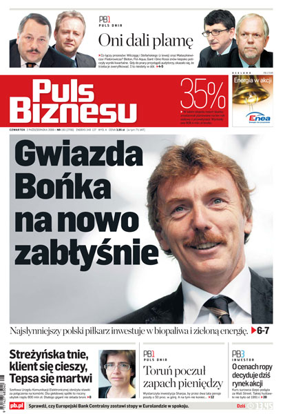 Zbigniew Boniek inwestuje w biopaliwa i zieloną energię; Anna Streżyńska obniżyła TP SA stawki za połączenia na komórki; dzięki inwestycji Sharpa pensje w Toruniu urosły o 50% w ciągu dwóch lat; największe od czasu wojny w Zatoce Perskiej zmiany notowań surowców do produkcji paliw; raporty półroczne pokazały słabość wyników części giełdowych spółek; mała firma z Gliwic tworzy kryształowe żyrandole dla szejków i książąt.