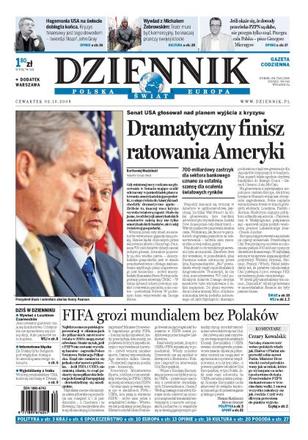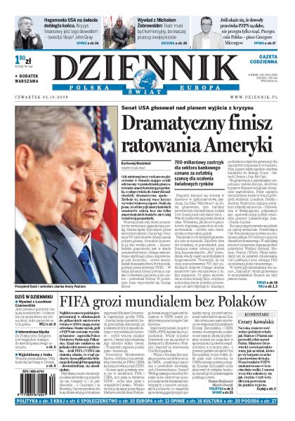 Senat USA głosował nad planem wyjścia z kryzysu, 700-miliardowy zastrzyk dla sektora bankowego to ostatnia szansa ocalenia światowych rynków; jeśli kurator nie zostanie wycofany z PZPN, FIFA może odwołać mecze eliminacji MŚ 2010 z Czechami i Słowacją; Jarosław Kaczyński chce rozmawiać z premierem o światowym kryzysie i omówić propozycję PiS ponadpartyjnego porozumienia dla gospodarki; porwany w Pakistanie Polak najprawdopodobniej żyje; Polacy rozpoczęli wycofywanie się z Iraku; w UE tylko Bułgaria ma gorszy dostęp do szerokopasmowego internetu niż Polska; studenci płatnych uczelni wygrywają konkursy świadectw, bo mają zawyżoną średnią; arthrotec wywołujący poronienie można bez problemu kupić w internecie.