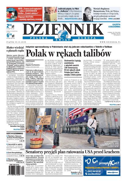 Pakistańscy talibowie przyznali się do uprowadzenia polskiego inżyniera, żądają uwolnienia 136 więźniów; senatorzy przyjęli plan ratowania USA przed krachem; czy kryzys zbliży Rosję do Unii; nie ma co przejmować się szantażem Blattera- mówią czescy działacze piłkarscy; wczoraj przed sądem Jaruzelski przekonywał, że stan wojenny był koniecznością; wywiad z Hansem- Gertem Poetteringiem; Lech Kaczyński idzie drogą Wałęsy - rozmowa z Bogdanem Borusewiczem; antyterroryści poszukiwali pod Krakowem dzikiego kota; jutro Dzień Adopcji Zwierząt. Dodatki: The Wall Street Journal, Warszawa, Kultura, Kultura TV