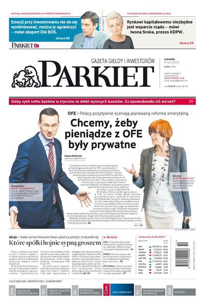 Największy w Polsce newsroom gospodarczy zbiera, analizuje i zgłębia dla Państwa najważniejsze informacje ze świata finansów. Codzienne wydanie „Parkietu”, sześć dni w tygodniu, to kilkadziesiąt artykułów o emitentach, instytucjach finansowych, gospodarce. To również opinie, felietony i wywiady z najważniejszymi ludźmi krajowej i globalnej finansjery.