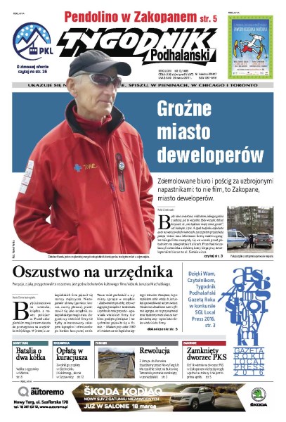 Zdemolowane biuro i pościg za uzbrojonymi napastnikami: to nie film to Zakopane, miasto deweloperów; pecyzja, z jaką przygotowali to oszustwo, jest godna bohaterów kultowego filmu Vabank Janusza Machulskiego; walka o egzaminy w Mieście; zwolnili go z opłaty w Ciechocinku i Kołobrzegu, ale nie w Szczawnicy; z Ustupu do Poronina dojedziemy przez Nowy Targ lub Murzasichle: skręt na Bukowinę Tatrzańską zostanie zamknięty w poniedziałek; od 1 kwietnia na dworzec PKS w Zakopanem nie będą mogły wjechać autobusy – i nie jest to prima aprilis.
