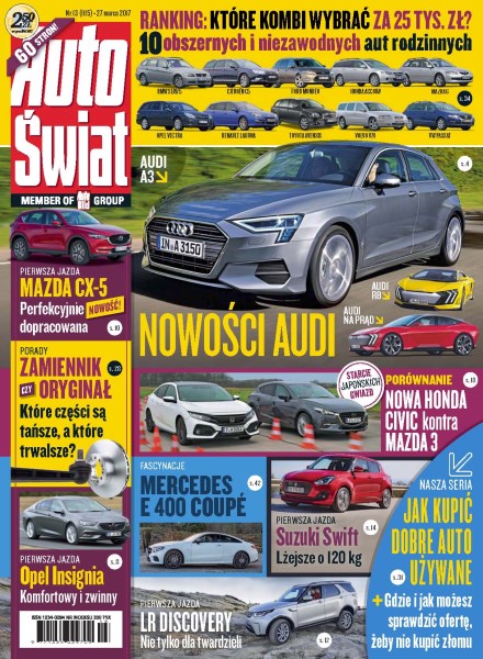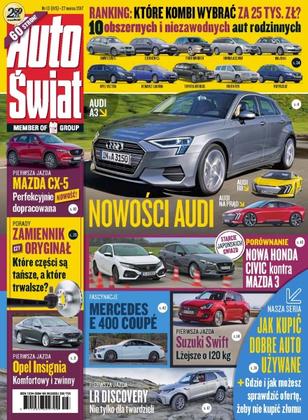 Nowości Audi – czwarta generacja A3 i modele sportowe; Opel Insignia Grand Sport – jeździliśmy nową Insignią; Mazda CX-5 – wrażenia z jazd nowym SUV-em; Land Rover Discovery – pierwsza jazda nowym Disco; Suzuki Swift – maluch piątej generacji; Honda Civic kontra Mazda 3 – porównanie japońskich kompaktów; Kia Sorento – komfortowy SUV z dieslem 2.0; Nissan X-Trail – testowany z Czytelnikami; Abarth 124 Spider – sportowy roadster; zamienniki bywają lepsze od oryginalnych części z ASO.