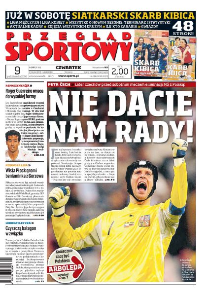 Drugi raz nas nie pokonacie - wywiad z czeskim bramkarzem Petrem Cechem; Michał Kleiber - z FIFA nikt nie ma szans wygrać; Boniek chce stworzyć Piłkarskie Biuro Podróży; Roger Guerreiro wraca do wysokiej formy; wywiad z Manuelem Arboledą, obrońcą Lecha Poznań; inwestycje w siatkówkę przynoszą największą stopę zwrotu; w przyszłym roku Kubica mocniej powalczy o mistrzowski tytuł.