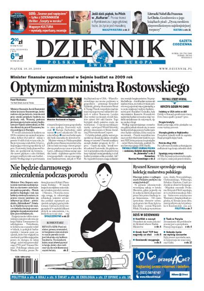 Minister finansów zaprezentował w Sejmie budżet na 2009 rok; to premier ma zdecydować o tym, kto pojedzie na szczyt UE do Brukseli; Parlament Europejski zawiesi sankcje wobec reżimu Łukaszenki, gdy Białoruś uzna Związek Polaków; państwo nie będzie płacić za znieczulenia podczas porodów; czy Kijów pogrzebał szanse na wejście do NATO; oskarżanie Obamy o konszachty z terrorystami nie poprawiło pozycji McCaina w sondażach; w sobotę mecz Polska-Czechy. The Wall Street Journal: kryzys finansowy dzień po dniu.