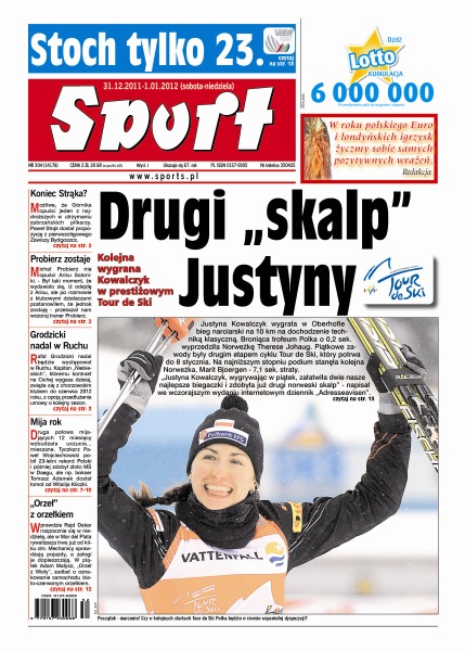 Justyna Kowalczyk wygrała drugie zawody Tour de Ski i zdobyła już drugi norweski „skalp”; drogi Paweł Strąk z Górnika Zabrze dostał propozycję od Zawiszy Bydgoszcz; Michał Probierz jednak nie opuści Arisu Saloniki; transferowe niewypały minionego lata; Bora Milutinović przesyła życzenia polskim kibicom; mija międzyolimpijski rok 2011 cz. II lipiec-grudzień; w Dakar Rally Hołek chce wygrać, a Małysz dojechać; Gregor Schlierenzauer wygrał pierwszy konkurs Turnieju Czterech Skoczni.