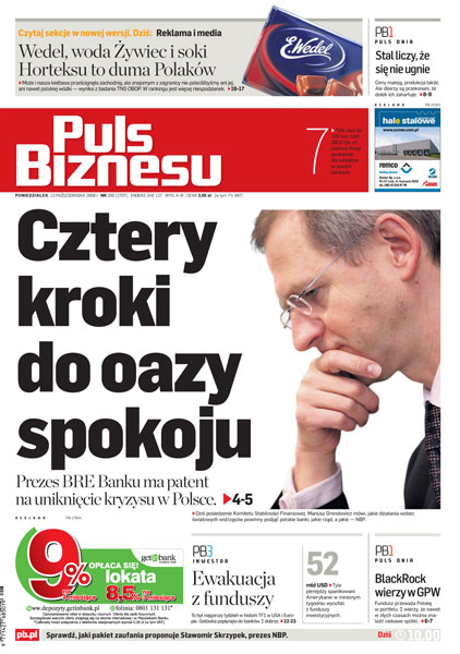 Prezes BRE Banku ma patent na uniknięcie kryzysu w Polsce; marki, z których dumni są Polacy; wyjaśniła się przyczyna panicznej wyprzedaży na Wall Street - akcji w pośpiechu pozbywały się amerykańskie fundusze inwestycyjne; BlackRock wierzy w polski rynek i chce wspierać klientów; branża poligraficzna w Polsce prężnie się rozwija i podbija Europę.