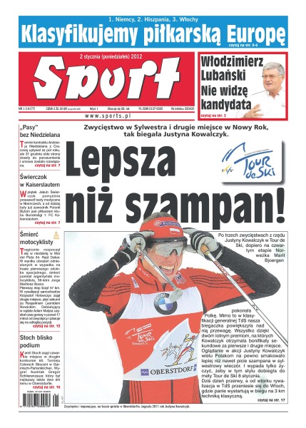 Dopiero na czwartym etapie Tour de Ski Justyna Kowalczyk uległa Marit Bjoergen i zajęła drugie miejsce; na trasie pierwszego odcinka specjalnego Rajdu Dakar zginął motocyklista Jorge Martinez Boro; Kamil Stoch zajął czwarte miejsce w drugim konkursie 60. Turnieju Czterech Skoczni w Garmisch-Partenkirchen.