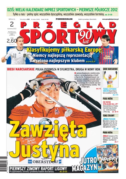 Dopiero na czwartym etapie Tour de Ski Justyna Kowalczyk uległa Marit Bjoergen i zajęła drugie miejsce; na trasie pierwszego odcinka specjalnego Rajdu Dakar zginął motocyklista Jorge Martinez Boro; Kamil Stoch zajął czwarte miejsce w drugim konkursie 60. Turnieju Czterech Skoczni w Garmisch-Partenkirchen.