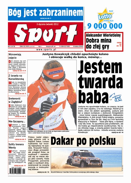 Justyna Kowalczyk mimo kontuzji kolana wystartuje dziś w biegu na 3 km techniką klasyczną w Toblach; Polonia Warszawa zakontraktowała wczoraj kapitana Beltaru Jerozolima Avirama Baruchyana; dziś treningi wznawiają Śląsk Wrocław i Widzew Łódź; Polacy nadal odgrywają główne role w Rajdzie Dakar – Łukasz Łaskawiec był najszybszy na quadzie, a Krzysztof Hołowczyc długo prowadził, ale przegrał finisz na wydmach i był czwarty na mecie, Kuba Przygoński awansował na czwartą pozycję w motocyklowej stawce.