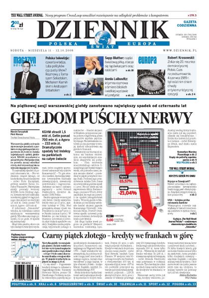 Na piątkowej sesji warszawskiej giełdy zanotowano największy spadek od czternastu lat; drożeje frank szwajcarski; Polsce nie grozi recesja - mówi w wywiadzie ekonomista Stanisław Gomułka; rządy nie potrafią zapobiec panice na rynkach finansowych; ani prezydent, ani premier nie zamierzają ustąpić w sprawie wyjazdu na szczyt Unii; sąd żąda ekshumacji ofiar Nangar Khel. Magazyn Dziennika: Sepp Blatter rządzi światową piłką, otaczając się łapówkarzami i rasistami. The Wall Street Journal: kryzys finansowy dzień po dniu.