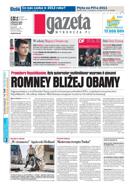 Mitt Romney, najpoważniejszy rywal Baracka Obamy przed wyborami prezydenckimi w tym roku, wygrał pierwsze prawybory Republikanów; firma Kodak walczy o przetrwanie; na nowej liście leków refundowanych NFZ zaoszczędzi 738 mln zł, a pacjenci dopłacą 302 mln zł więcej; Grzegorz Bierecki, prezes Krajowej SKOK zasiada w senackiej komisji finansów, która będzie zajmować się ustawami dotyczącymi SKOK.
